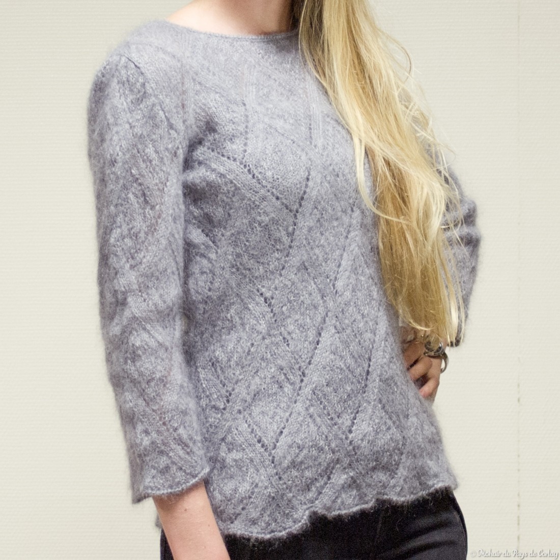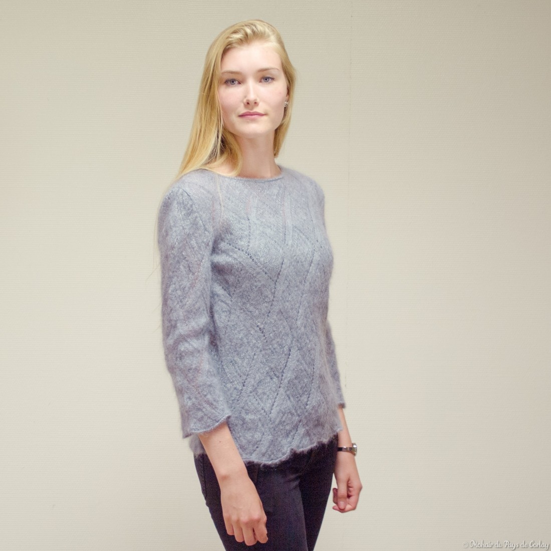 Le pull "Lys" en points ajourés est tricoté à la main avec 8 pelotes de fil DIVA en aiguilles n°3 ou 3,5.